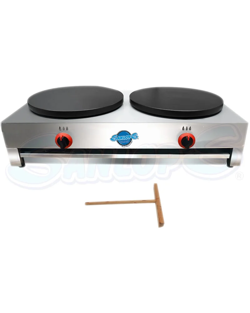Crepera industrial SANLOPS con doble plancha de 40 cm de diámetro elaboradas en teflón antiadherente, está esta equipada con un termostato graduable de 50 a 300°c para un calentamiento rápido y eficiente, cuenta con una función que previene la aparición de llamas abruptamente. Chasis rectangular con doble placa fabricado en acero inoxidable grado alimenticio, ideal para grandes producciones. Posee cajón para guardar elementos de uso (accesorios) Funcionamiento a 110V monofásico. Frecuencia 60hz. Incluye un molde para crepes