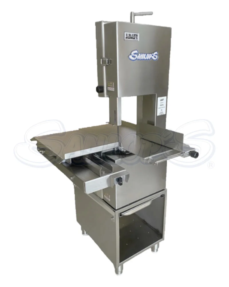 Sierra para corte de carne con hueso o carne congelada marca JAVAR línea SOLUTION. Modelo de piso para uso intermitente (hasta 1 canal diaria), ideal para pequeñas carnicerías. Estructura y volantes fabricados en acero inoxidable, material que cumple las actuales normas sanitarias (decretos 1500 y 3075). Altura de corte 22 cm, ancho de garganta 21 cm. Longitud de la cinta 78″. Diámetro del volante 25 cm. Reductor de larga vida con piñones de acero en baño de aceite. Potencia 1 HP, tensión 110 Volt, 60 Hz, 1 fase. Dim 65x80xH150 cm, peso neto 102 kg. Origen: Colombia